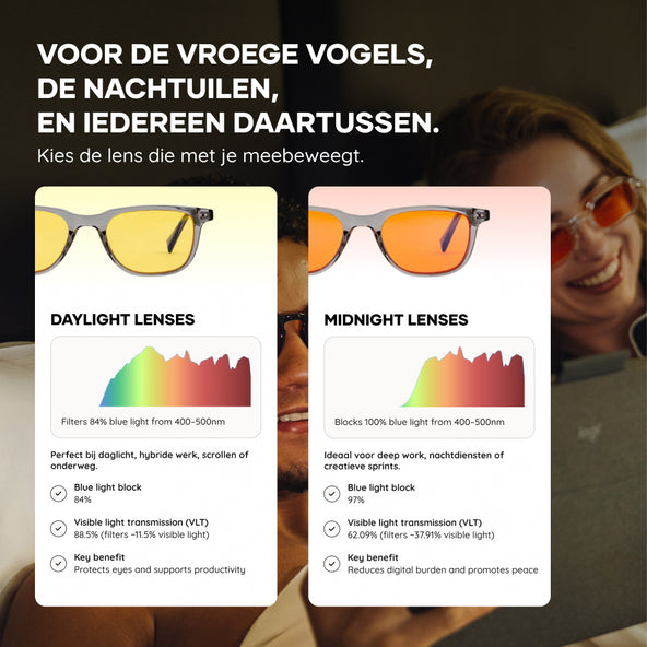 Onze blauwlichtbrillen bieden wetenschappelijk bewezen bescherming voor uw ogen en uw slaap. Ze zijn ideaal voor iedereen die veel tijd voor schermen doorbrengt, zowel overdag als 's avonds.