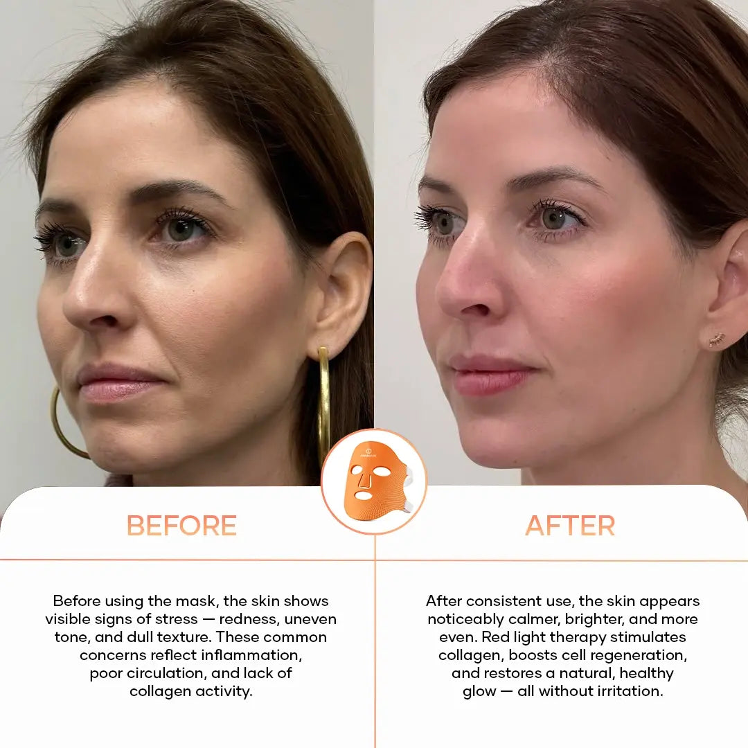 Rødlysterapi stimulerer kollagenproduktionen og forbedrer hudens elasticitet. Dette reducerer fine linjer, rynker og en mat teint — for en synligt glattere og fastere hud.