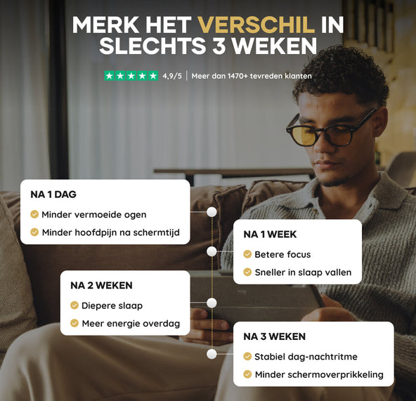 Voor het beste en langdurige resultaat gebruik je de bril consistent. Dagelijkse bescherming garandeert een optimaal functionerend bioritme en vermindert structureel digitale oogstress.