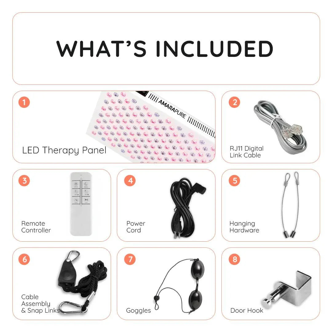 Oversigt over alle dele, der følger med LED-terapipanelet.
