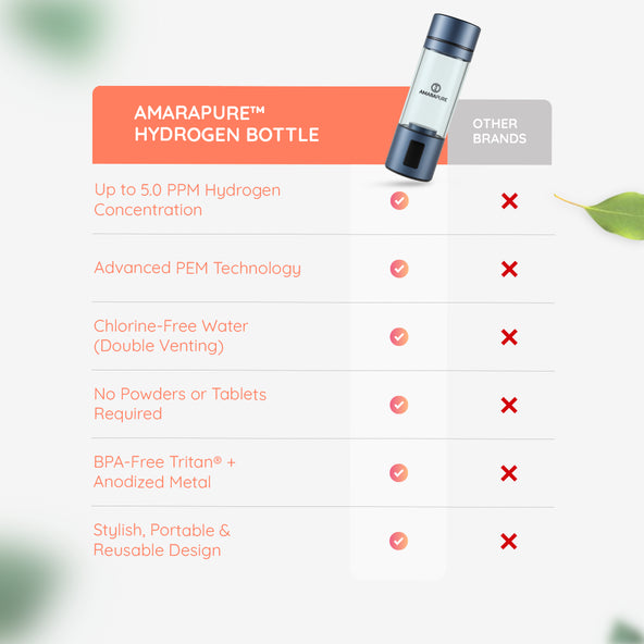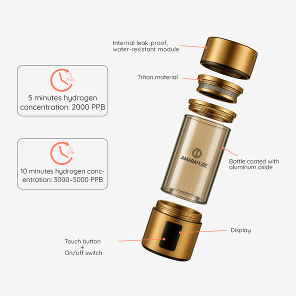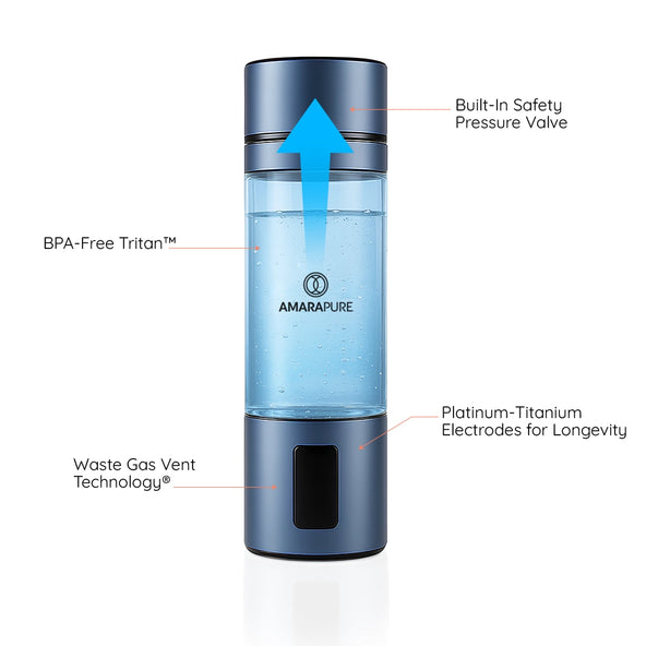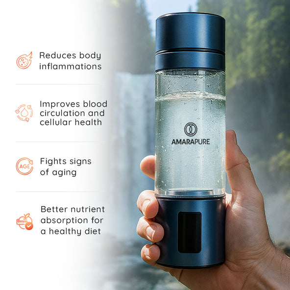 AmaraPure™ enriches your water with up to nine times more therapeutic hydrogen via the hydrogen water bottle, turning ordinary hydration into a powerful ally against oxidative stress and free radical damage. Just 1 to 3 bottles a day can give your body a boost, leaving you energized, ultra-hydrated, and ready for anything.