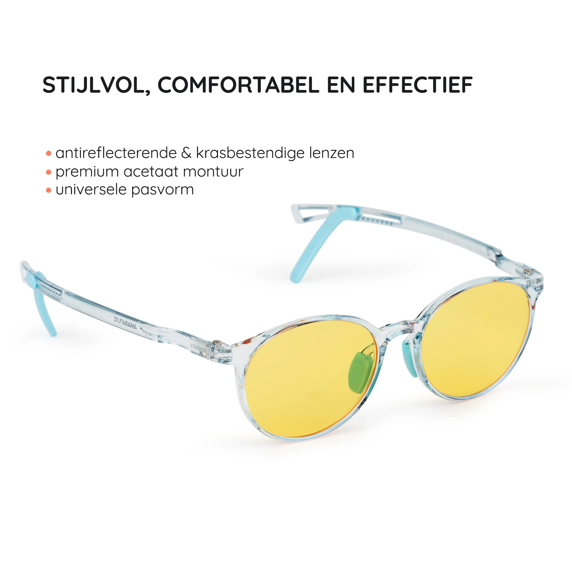 Ontdek de unieke eigenschappen van onze AmaraPure Blue Light Bril. Beweeg over de hotspots om meer te leren over het ontwerp, de bescherming en het comfort dat deze bril biedt.