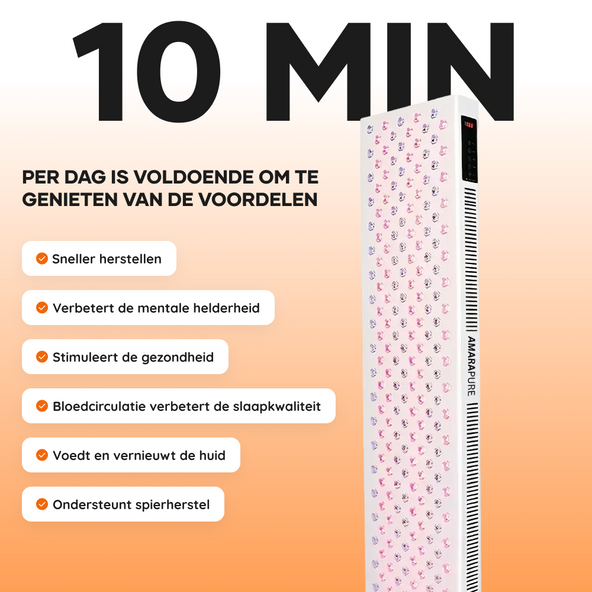 • Afstand & duur: 5–10 minuten per zone als start; bouw op naar 10–20 minuten per gebied. Houd 15–45 cm afstand volgens de handleiding. Start met 3–5 sessies per week.