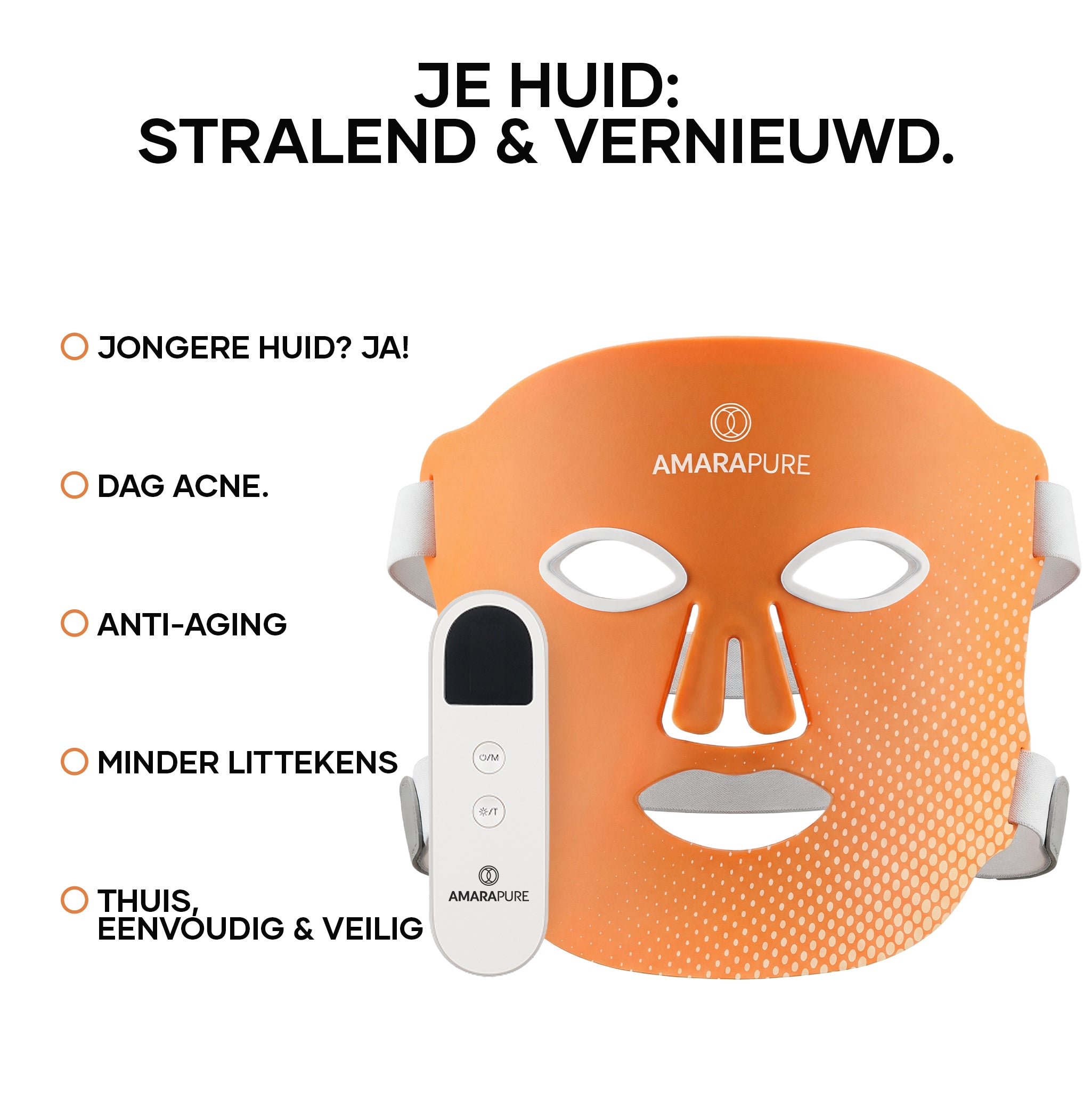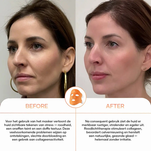 Het roodlichtmasker stimuleert de collageenproductie en verbetert de huidstructuur. Je huid voelt steviger, gladder en zichtbaar frisser – elke dag opnieuw.